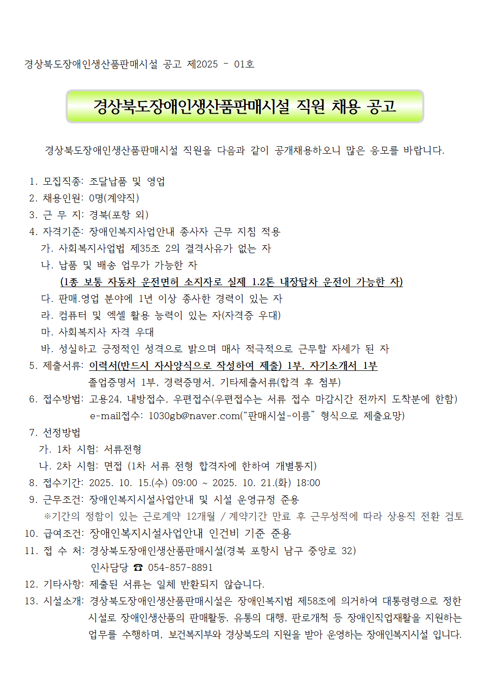 경상북도장애인생산품판매시설에서 근무할 인재를 공개채용 합니다.