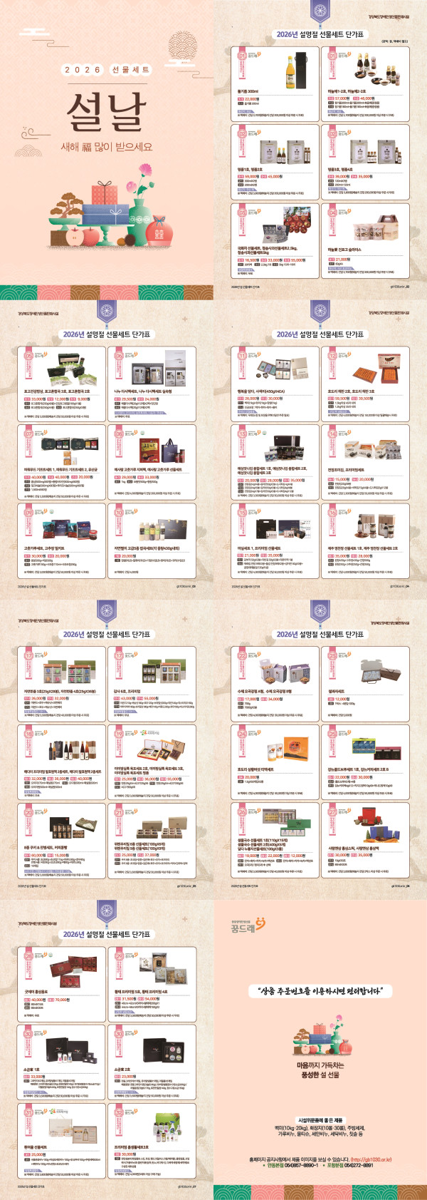 2026년도 설 명절 카다로그 최고관리자 2026-01-12 최고관리자 0 55 01.12 15:22 2026년도 설 명절을 맞이하여 지역 내 생산시설에서 직접 만든 제품들과 다양한 중증장애인생산품 선물세트를 준비하였습니다. "시설 위문품이나 직원 명절선물 " 등 많은 이용 바랍니다.